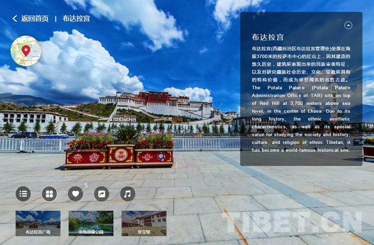 “實(shí)境西藏”展館,包含西藏自治區(qū)七地市共66幅360°實(shí)景圖,圖中包含西藏風(fēng)物實(shí)景以及漢英雙語簡介。在這里,既有高遠(yuǎn)與寧靜,又有遼闊與雄奇,藍(lán)天白云、雪山冰川、佛塔寺廟、暗夜星軌……風(fēng)景如畫的西藏猶如長軸畫卷緩緩鋪開。